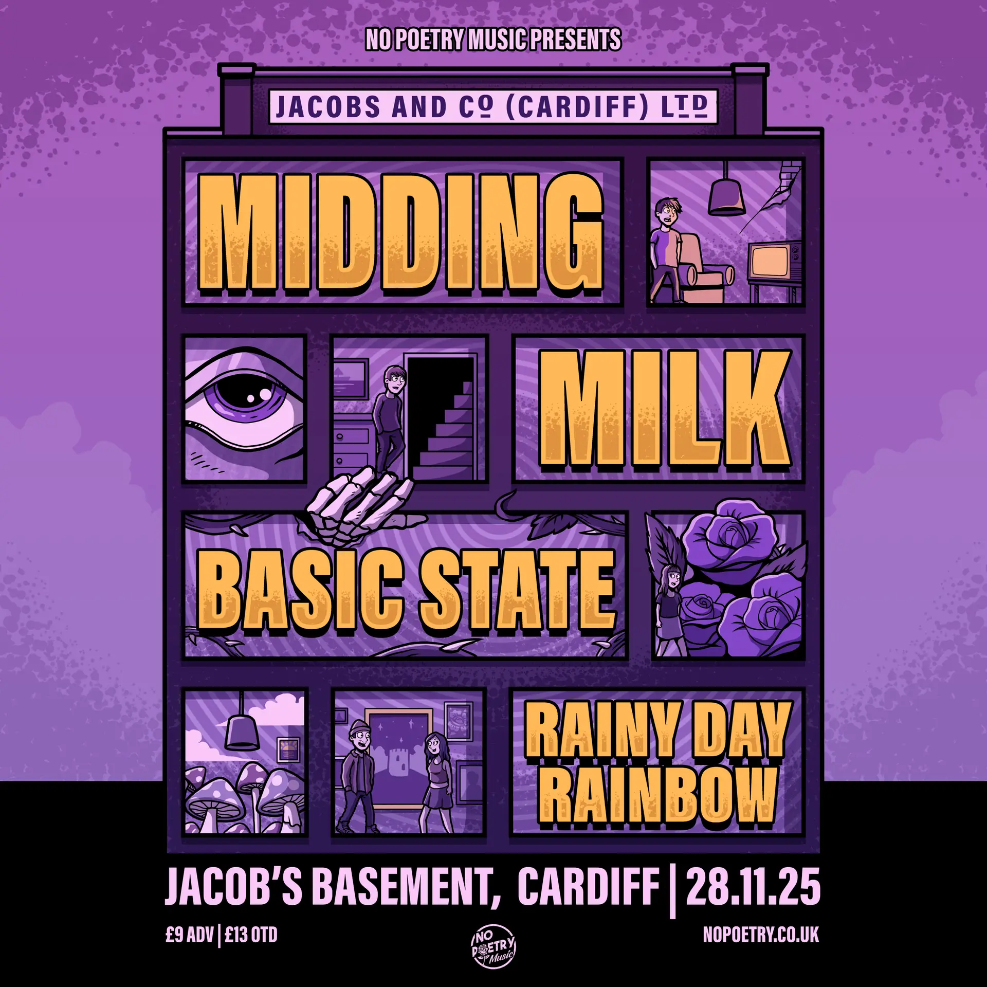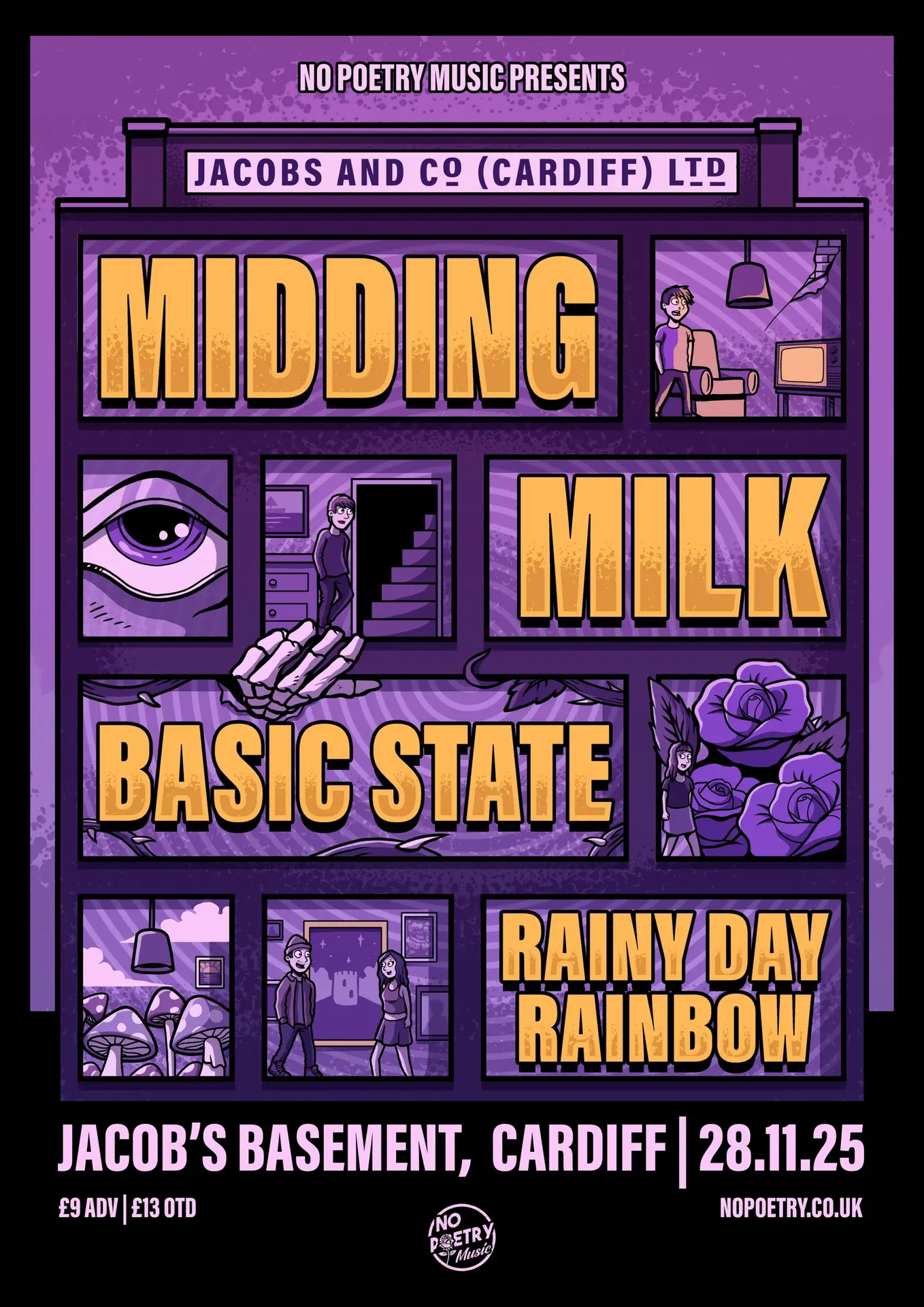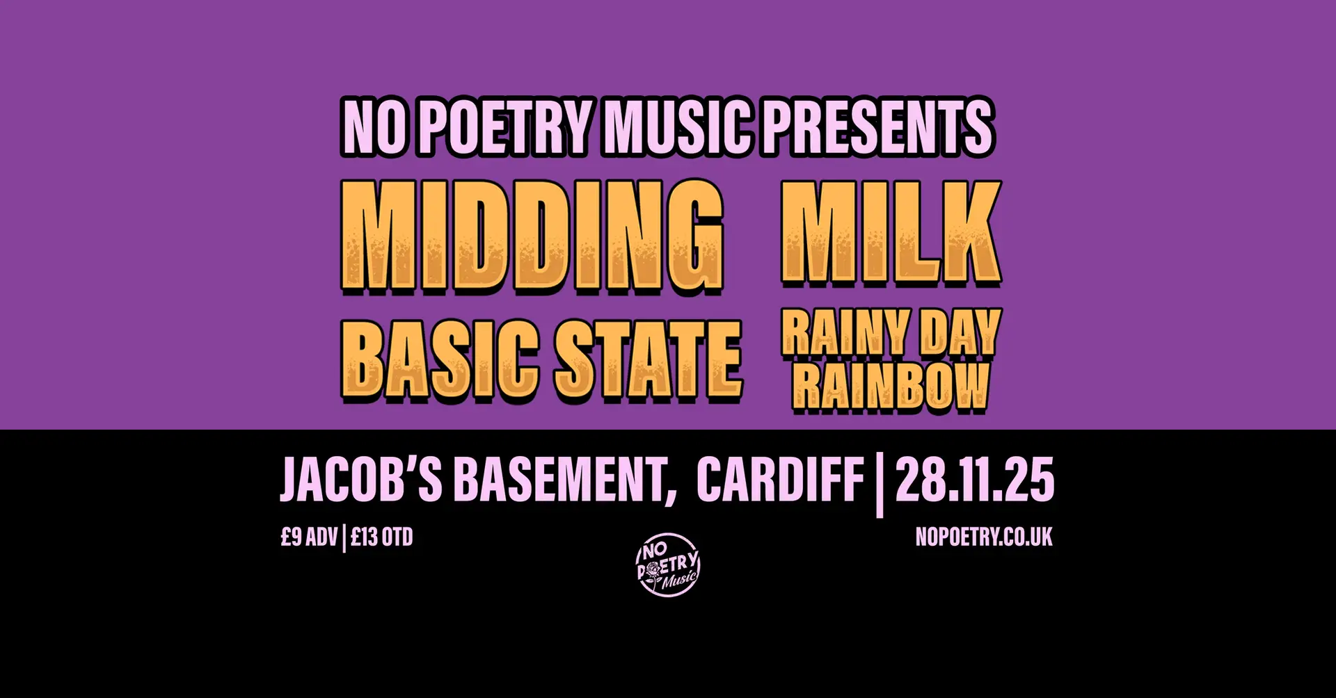 No Poetry Music returns to Cardiff for a night of fuzz, feedback, and full-bodied chaos, this time buried beneath Jacobs Antique Market, in the legendary Jacobs Basement. Expect sweat on the ceiling, pedals on the floor, and four of South Wales’ best noise-makers in one low-lit room.